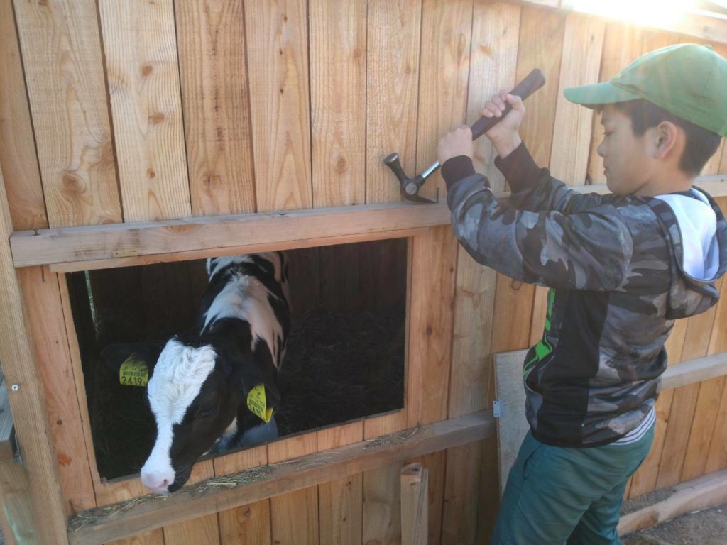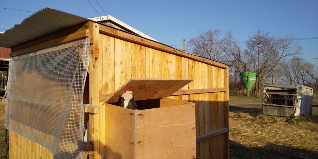 「うーん、木の香りが気持ちいい!」と、子牛が思っているかは分かりませんが、少なくとも私は哺乳の時、中に入ったら、子牛と一緒に昼寝したい心地よさでした。
